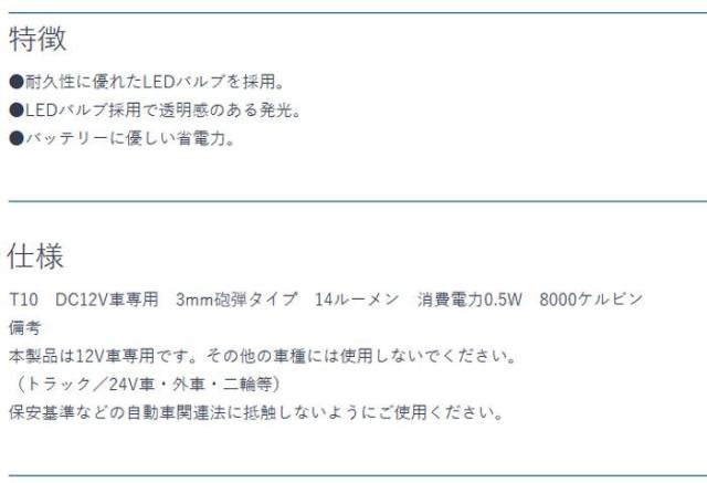 商品詳細:耐久性に優れたLEDバルブを採用しています。LEDバルブ採用で透明感のある発光が特徴です。バッテリーに優しい省電力です。 生産国:台湾 素材・材質:PC樹脂