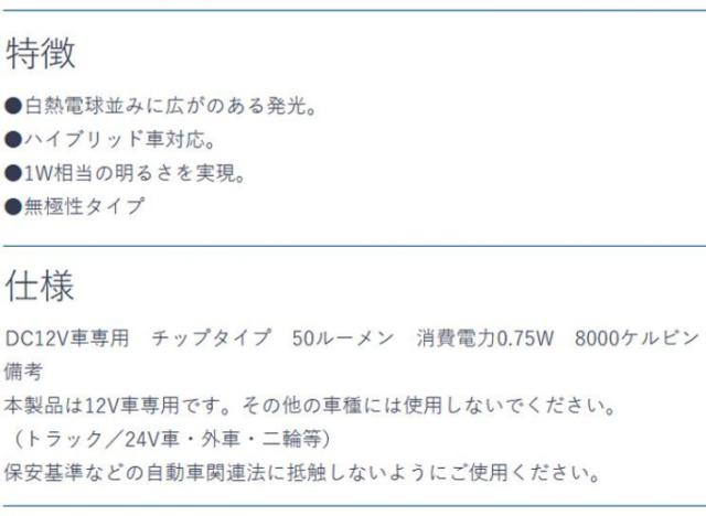 商品詳細:白熱電球並みに広がのある発光が特徴です。ハイブリッド車対応です。1W相当の明るさを実現しました。無極性タイプです。 生産国:台湾 素材・材質:PC樹脂 仕様:形状:T10×31