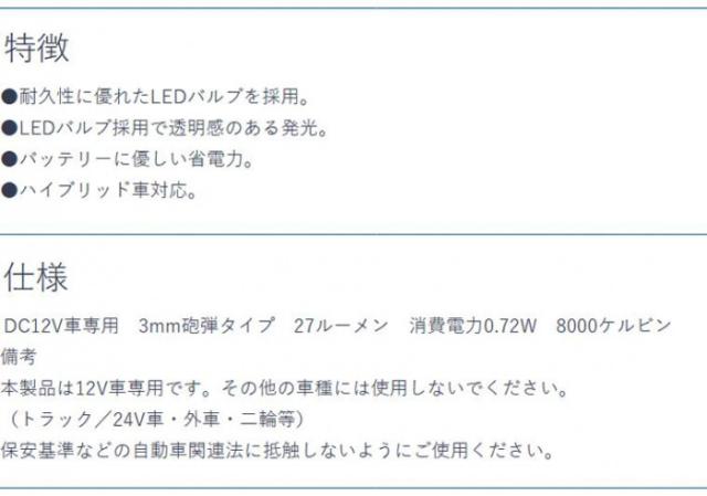 商品詳細:耐久性に優れたLEDバルブを採用しています。LEDバルブ採用で透明感のある発光が特徴です。バッテリーに優しい省電力です。ハイブリッド車対応です。 生産国:台湾 素材・材質:PC樹脂 仕様:形状:T16