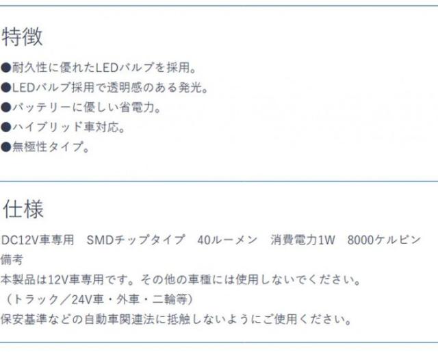 商品詳細:耐久性に優れたLEDバルブを採用しています。LEDバルブ採用で透明感のある発光が特徴です。バッテリーに優しい省電力です。ハイブリッド車対応です。無極性タイプです。 生産国:台湾 素材・材質:PC樹脂 仕様:形状:T16
