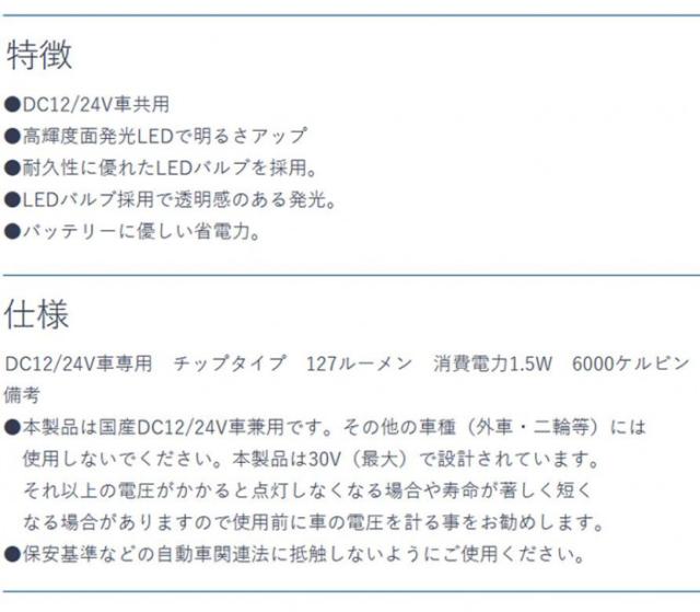 商品詳細:DC12/24V車共用です。高輝度面発光LEDで明るさがアップします。耐久性に優れたLEDバルブを採用しています。LEDバルブ採用で透明感のある発光が特徴です。バッテリーに優しい省電力です。 生産国:中国 素材・材質:PC樹脂 仕様:形状:3種類ハーネス付T10/T10×31/G14