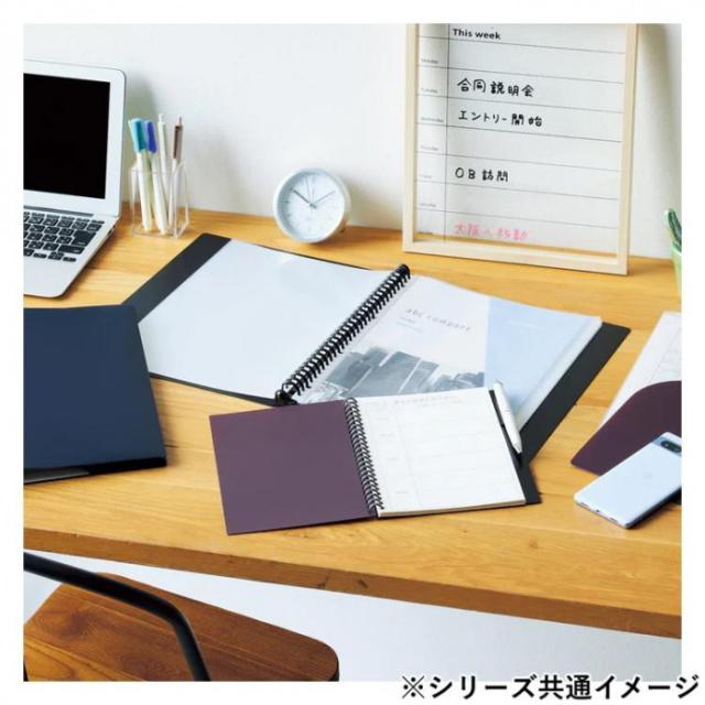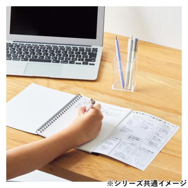 | ルーズリーフみたいにリーフが追加・交換できるノート。自己分析がまとめられる、4ステップの自己分析リーフ、企業分析シート付き。リーフの下に企業分析シートを敷き、シートに沿って書き込めば企業分析ができます。下じきになるペンホルダー付き。クリップ付きのペンを保持できます。企業ごとにスケジュール管理ができる日付フリータイプのマンスリーリーフも追加可能(別売)。 あけるとき:リーフを持ち、斜めに軽く引くと、とじ具が開きます。 とじるとき:リングをつまみ、指を滑らせて音がするように順番に閉じると簡単です。 |