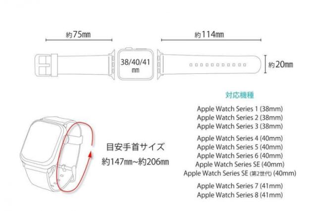 | 仕様 | 【対応機種】 Apple Watch 1 / 2 / 3 の38mmタイプ Apple Watch 4 / 5 / 6 / SE / SE(第2世代) の40mmタイプ Apple Watch 7 / 8 の41mmタイプ |