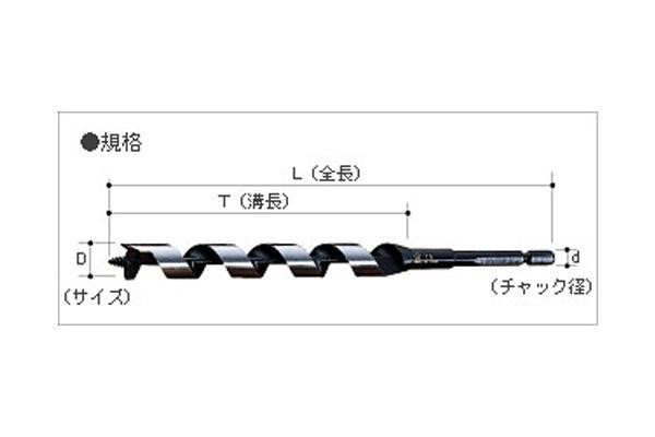 商品詳細:柱の穴あけに最適。インパクトドライバー(12V以上)での使用は引き込みネジのピッチを細かくし、ネジ山を小さくすることにより抵抗を少なくしΦ21mmまでの穴あけ加工が可能です。 生産国:日本 商品サイズ:サイズ(D):13.5mm、全長(L):205mm、溝長(T):135mm、チャック径(d):6角軸6.35mm