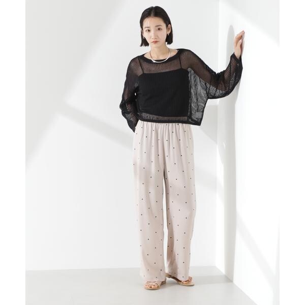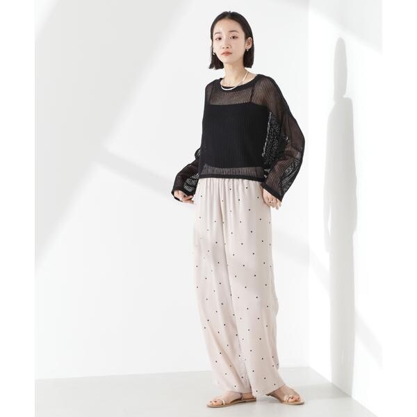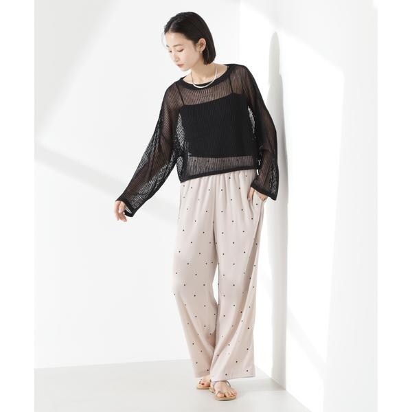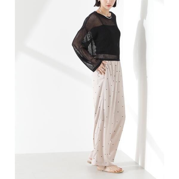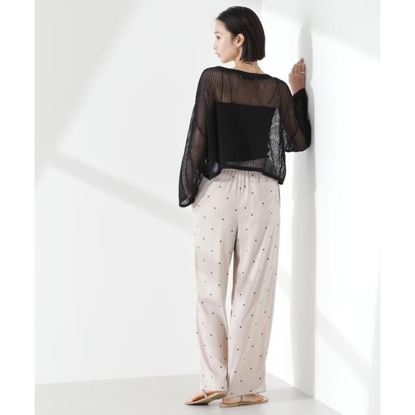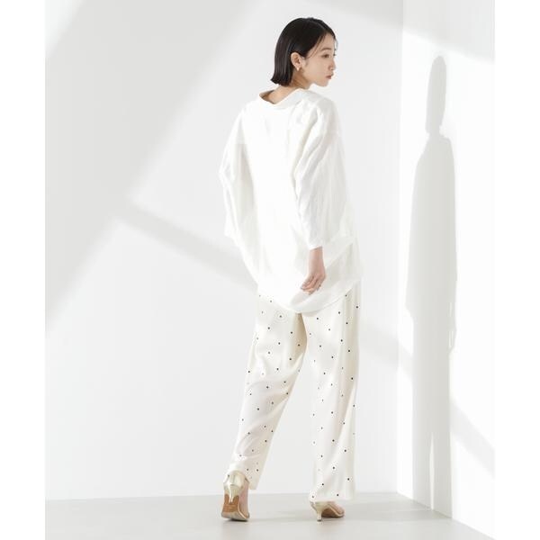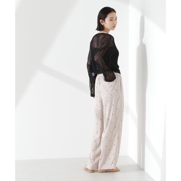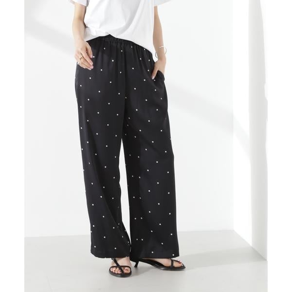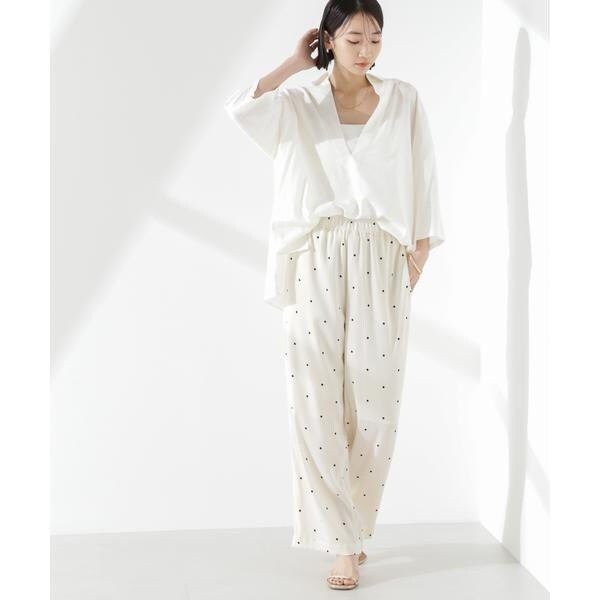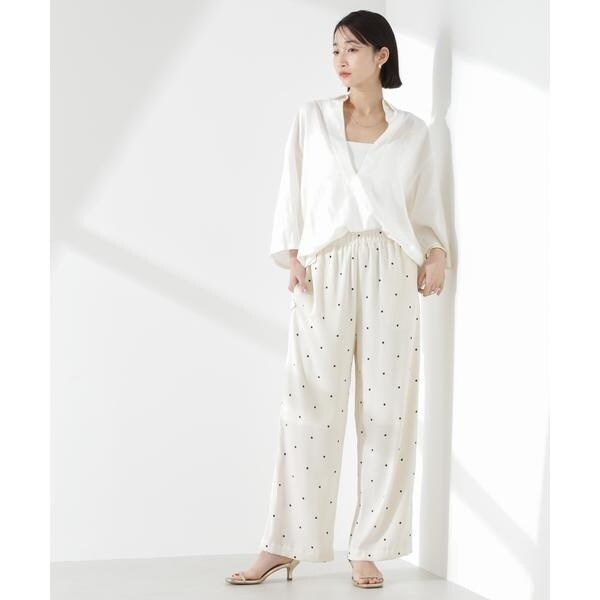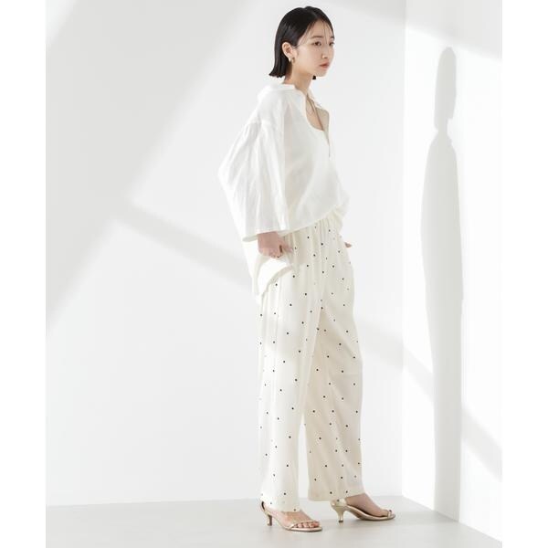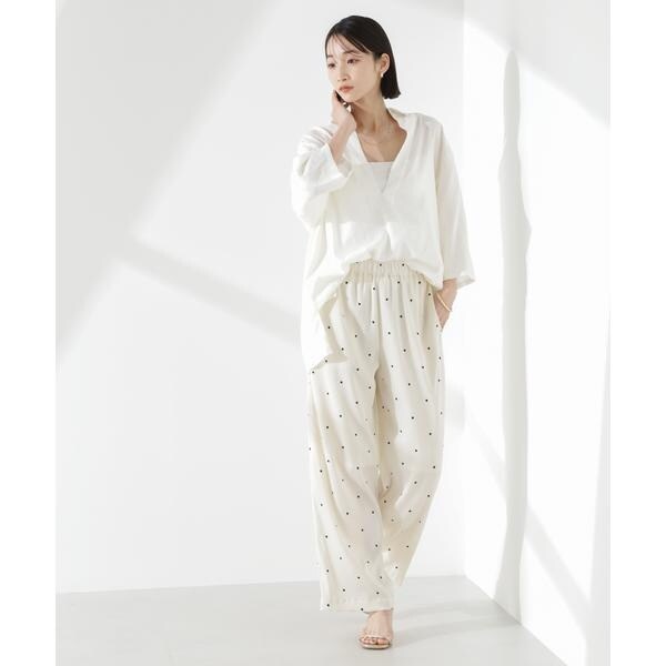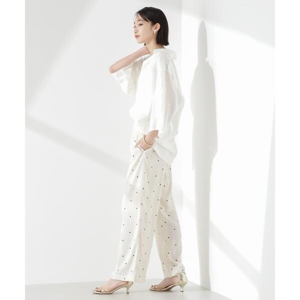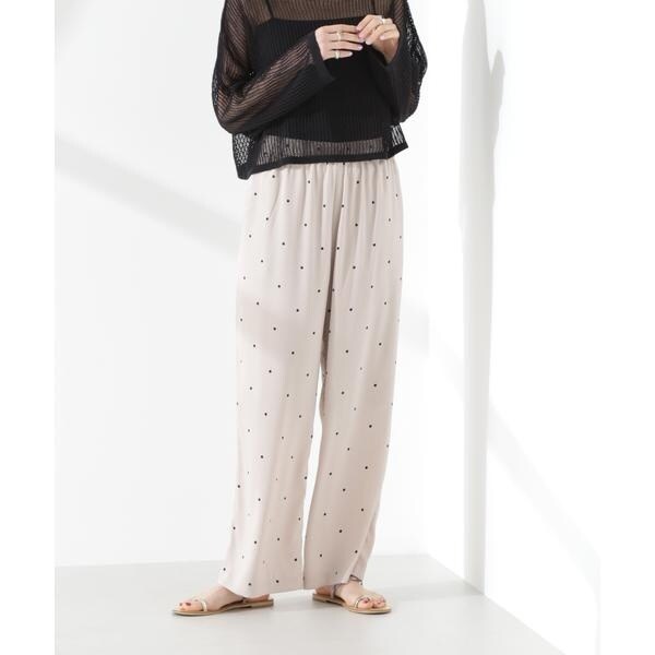 オリジナルのドット柄プリントが目をひくイージーパンツ。カジュアルでフェミニンさのあるドット柄と、ワイドストレートのシルエットが大人っぽいバランス。同素材のブラウスと合わせたセットアップスタイルもおすすめです。