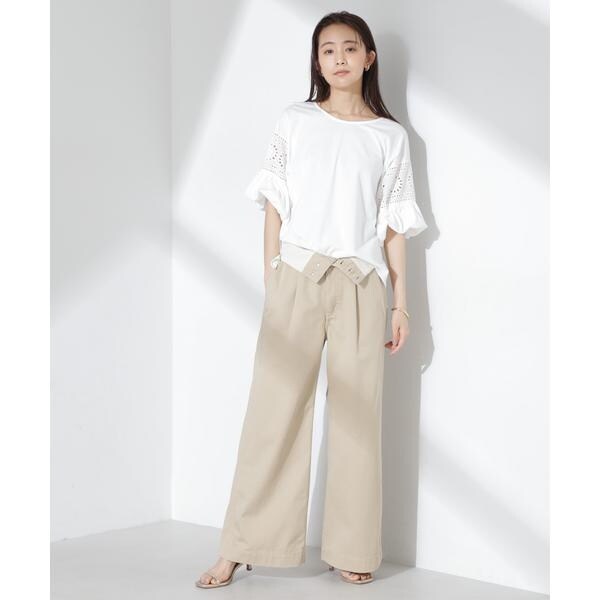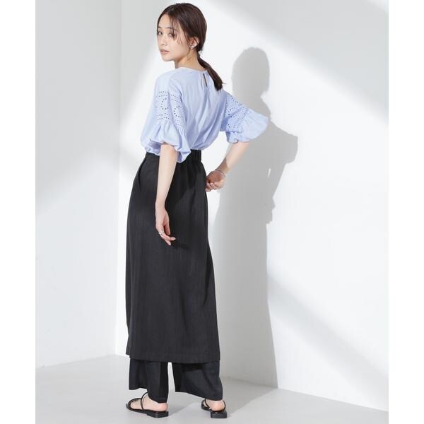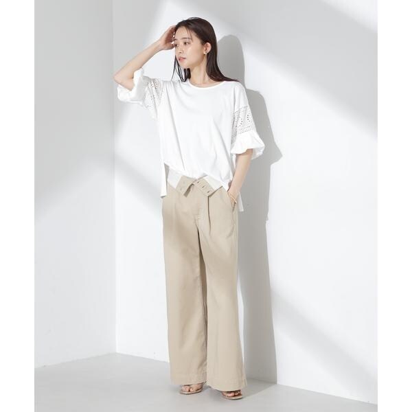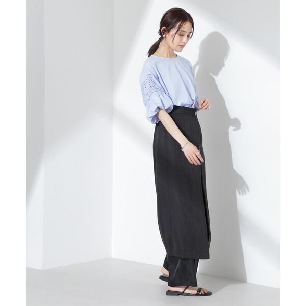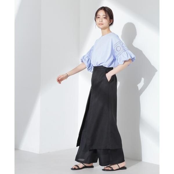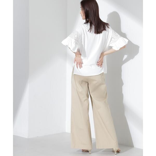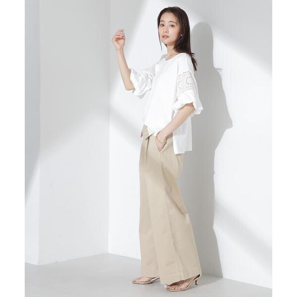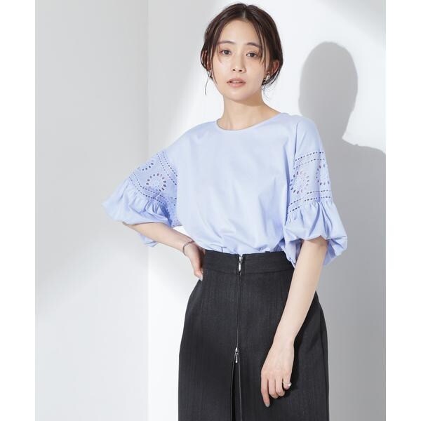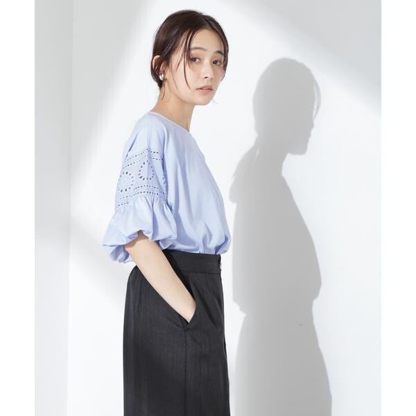 女性らしく映えるレース切り替えスリーブのカットトップス。女性らしく柔らかい印象のフラワー柄カットワークレースと立体的なバルーンスリーブが相まって、女性らしさを底上げしてくれる着映えアイテムです。