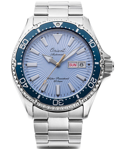 限定モデルでは青空をイメージし、風を切るような爽快感のある放射の型打ち模様が特長です。また、太陽の光をイメージしたゴールドの秒針もスカイブルーの文字板に映えます。