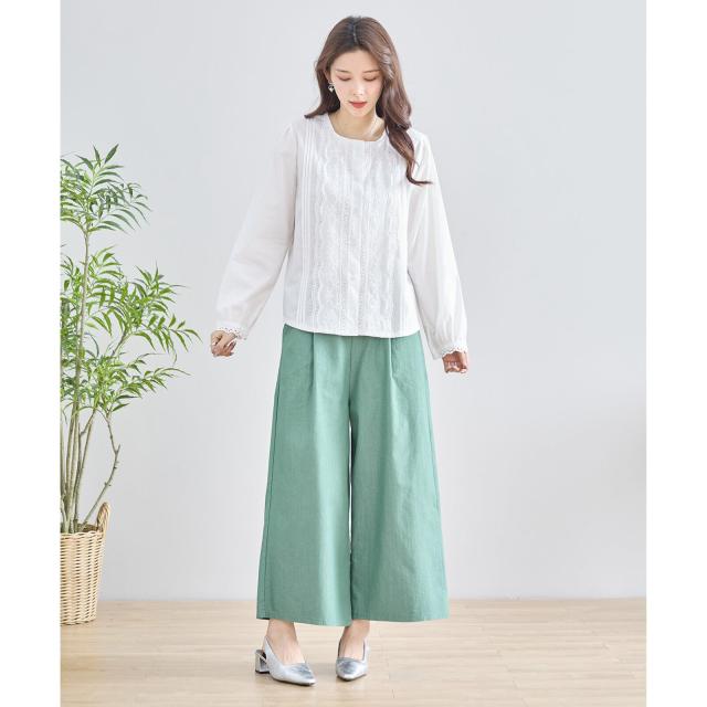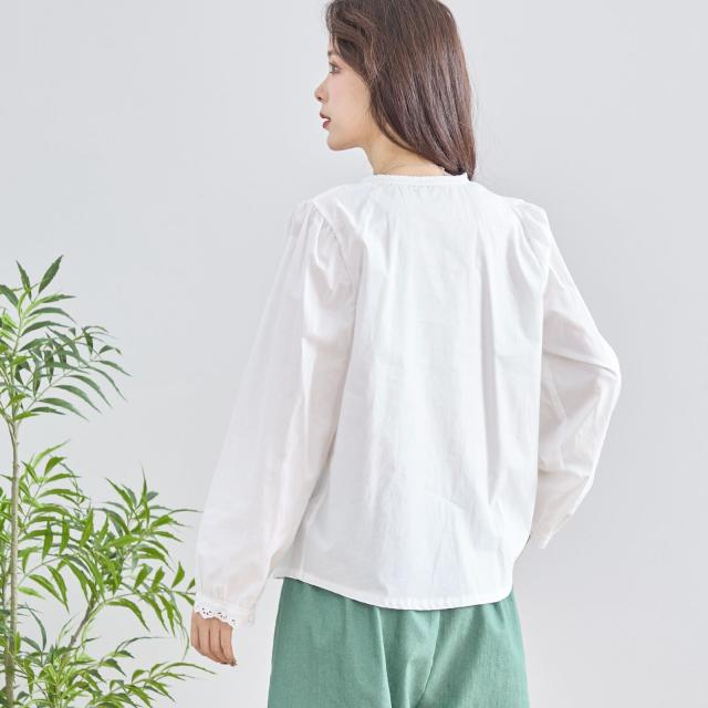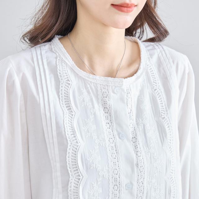繊細なレースと刺繍が施されたクラシカルなブラウス。コットン素材で着心地も軽やか。シンプルながらもエレガントなデザインは、パンツやスカートと合わせるだけで洗練されたスタイルに。デイリー使いから特別な日まで、幅広いシーンで活躍する一枚です