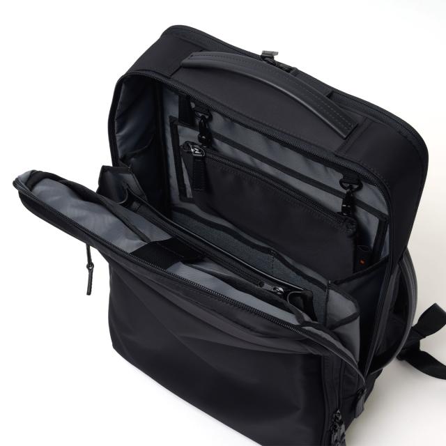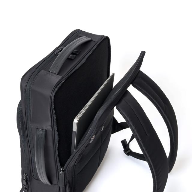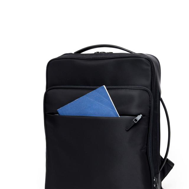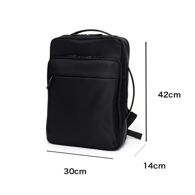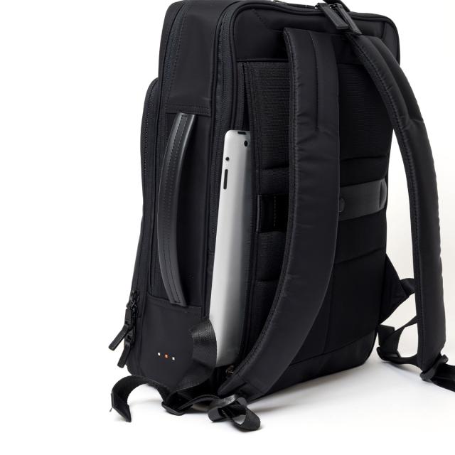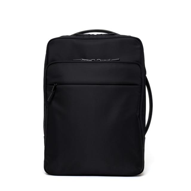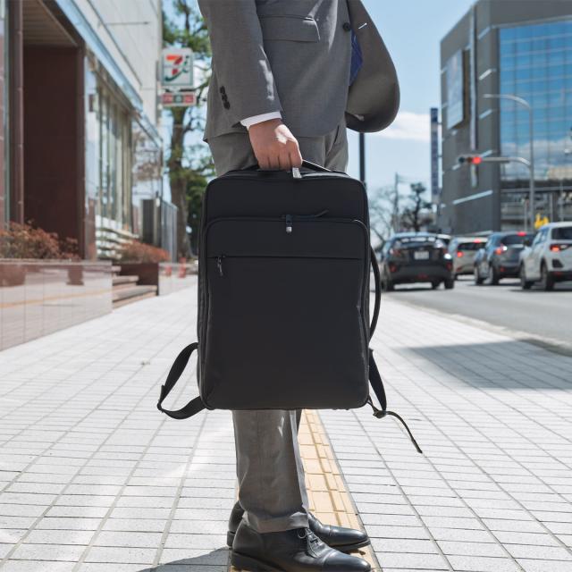 多彩な機能性とスタイリッシュさを兼ね備えたビジネスリュックです。シンプルなブラックのデザインは、どんなビジネスシーンにもマッチし、洗練された印象を与えます。本体素材には撥水性に優れたナイロンを採用しているため、雨の日でも安心して使用することができます。