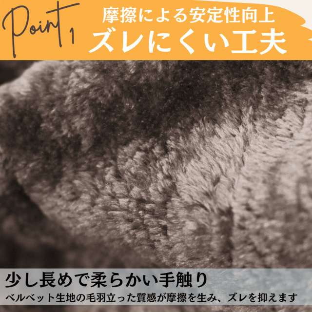 | 特徴1 | 少し長めの毛ば立ったベルモット生地が摩擦を生み、ズレを抑えます |