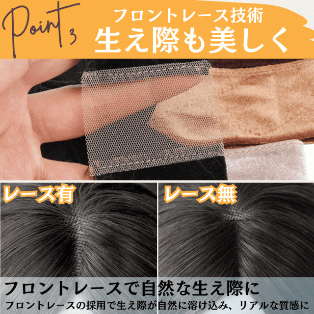 フロントレース採用で、生え際が自然になり、リアルな質感を損なわない |