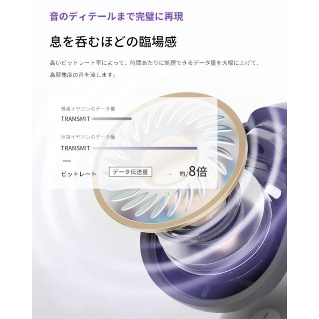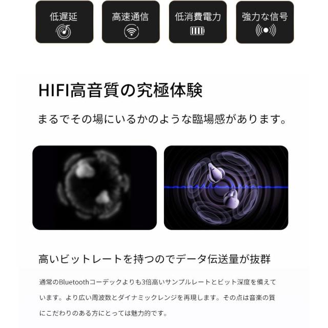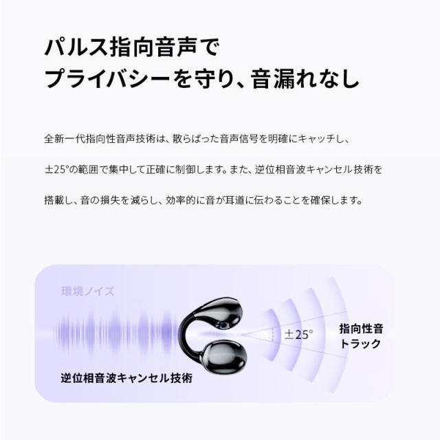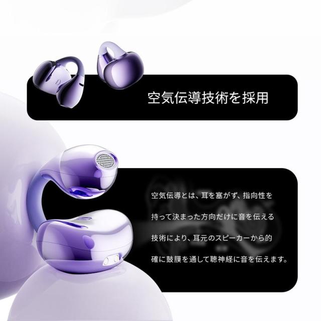 指向性のある空気伝導技術を採用し、従来の骨伝導による振動やかゆみの問題を解決し、独自の技術で骨を通さずに直接耳に音を伝えます。