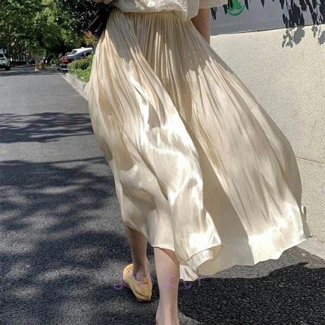 ウエストゴム L こなれ感 オフホワイト Aライン 上品 体型カバー きれいめ レディース プリーツ ロングスカート M お出かけ フレア ボトムス レトロ おしゃれ タックプリーツ S 大人可愛い