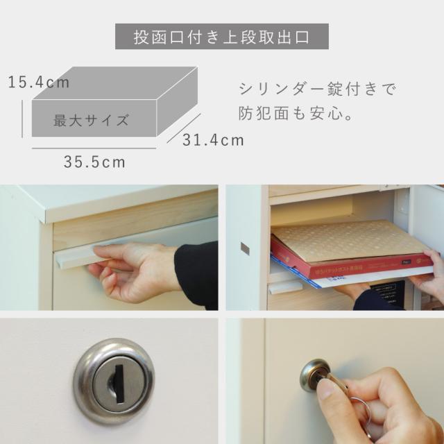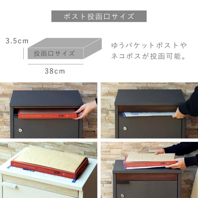 上段収納の投函口サイズは幅38×高さ3.5cmと大きなサイズ設計で、ゆうパケットポストやネコポスが投函可能です。