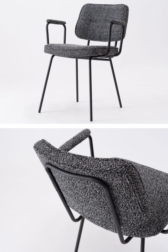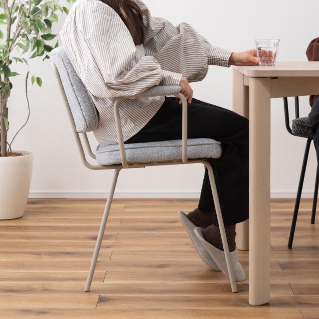 アーム部分に特徴的なデザインを施したダイニングチェアです。デザイン性と使いやすさ、快適さを兼ね備えています。シンプルなのでどんなインテリアにも馴染みやすいです。