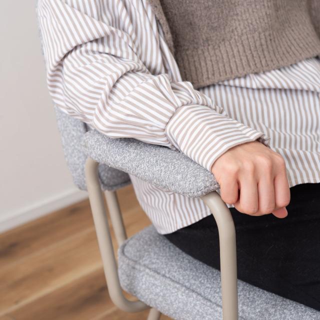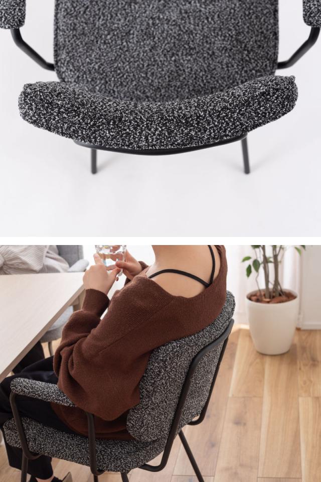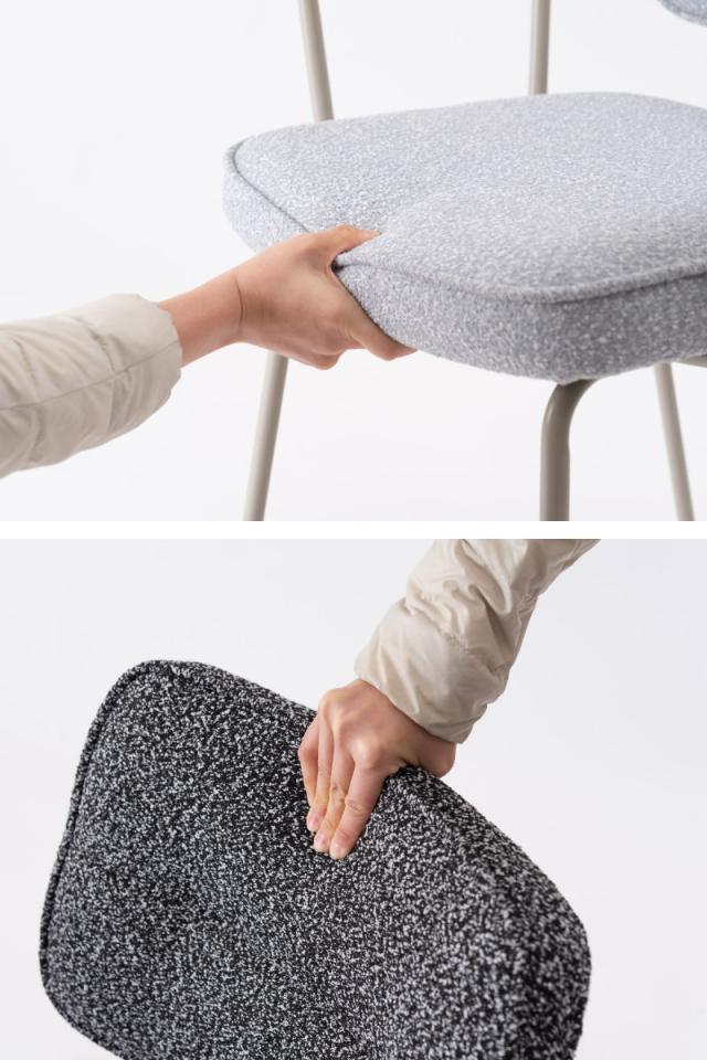 落ち着きのある優しい印象のブークレ生地を使用しています。ふんわりもこもことした心地い良い質感と柔らかな肌触りが特徴的で、しっかりとした座り心地です。