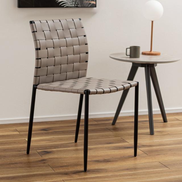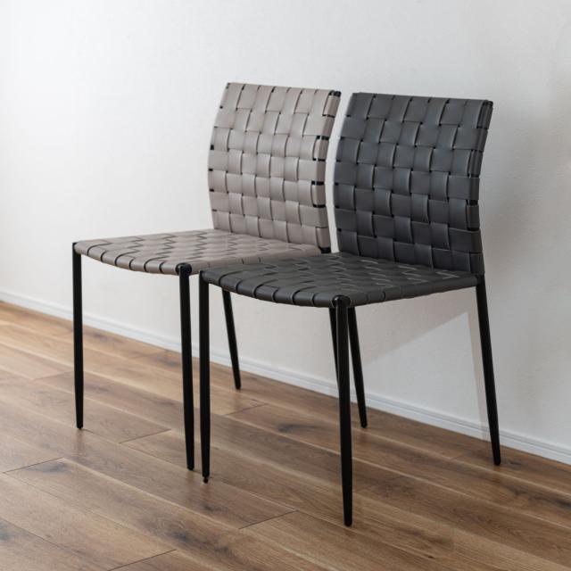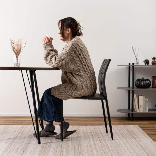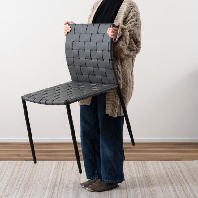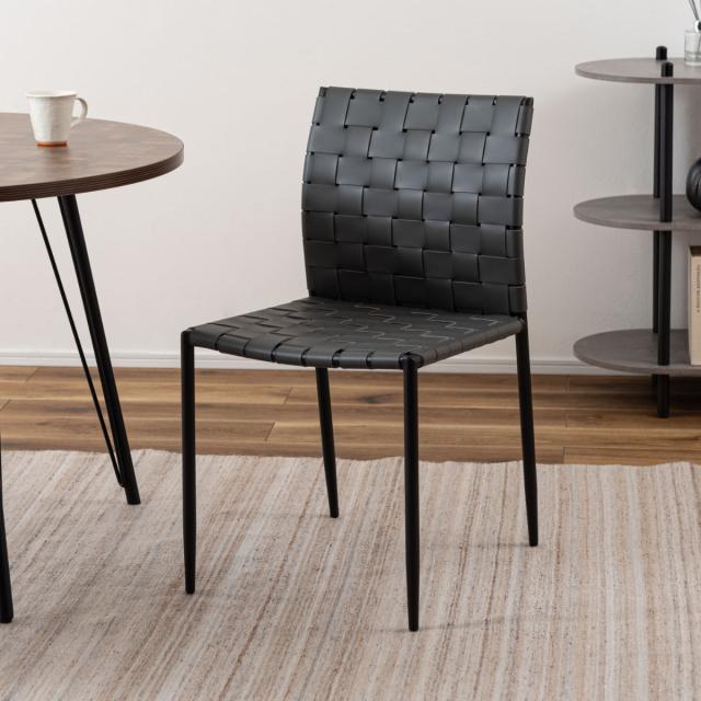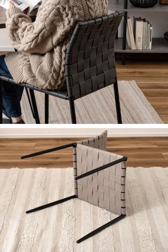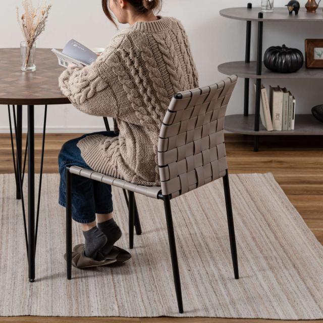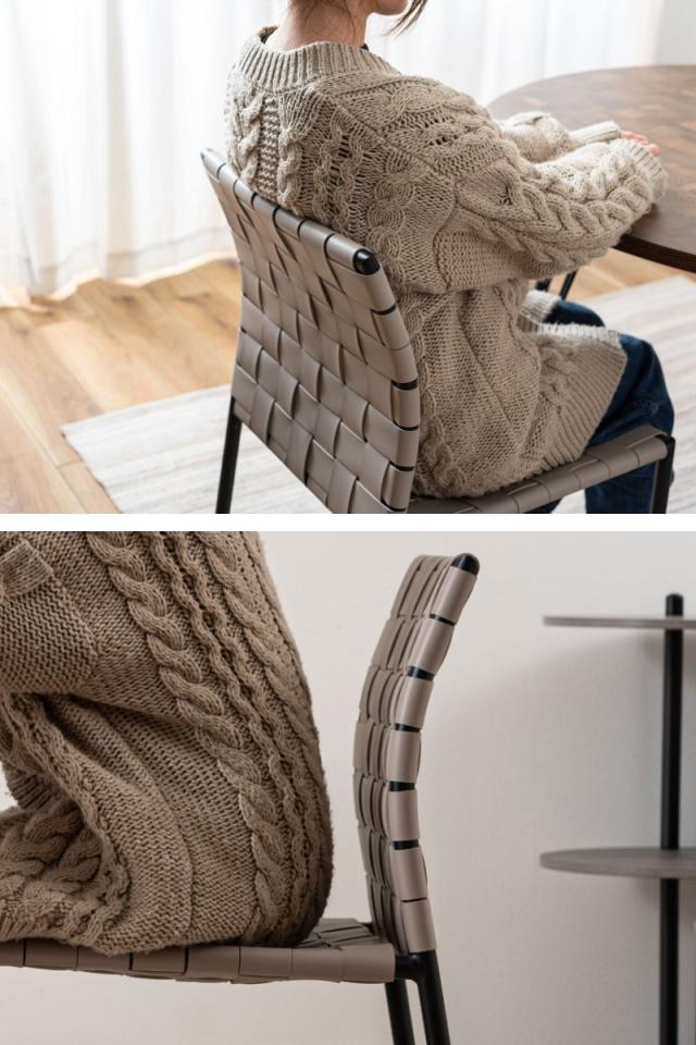 合皮の生地を編み込んだ背もたれと座面が程よくしなり、ゆったりと身体を支えてくれるチェアです。様々なテイストに合わせられるデザインになっております。アームレスのため立ち座りもスムーズにできます。