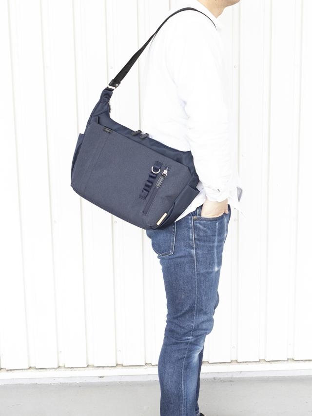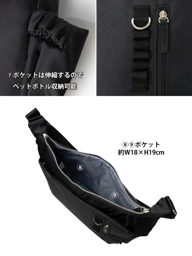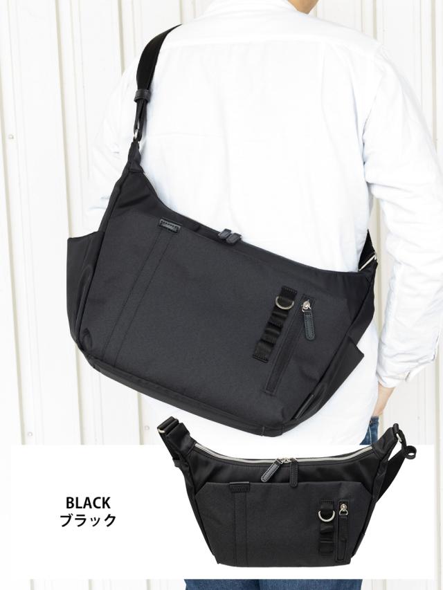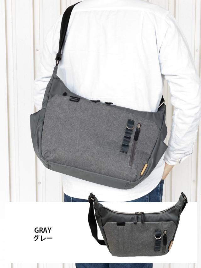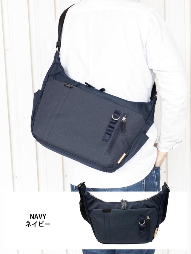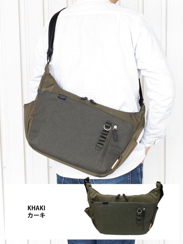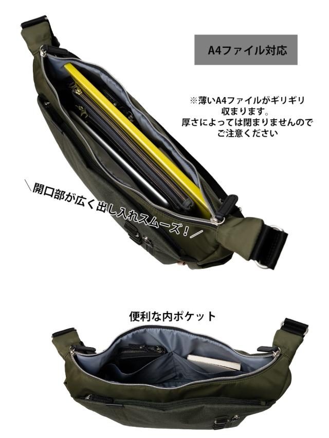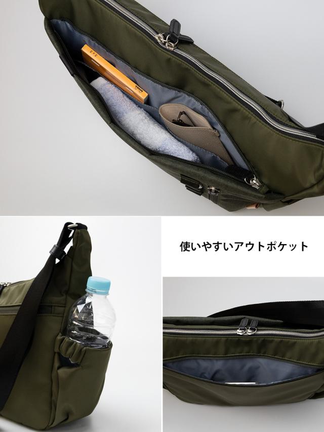 ■A4ファイルがギリギリ収まる程よい収納力の機能的なショルダーバッグです。人気の杢調ポリを前面ポケット部分に使用しテープをポイントに使ったシンプルでかっこいいデザインになっています。