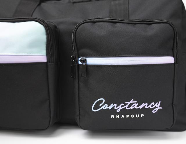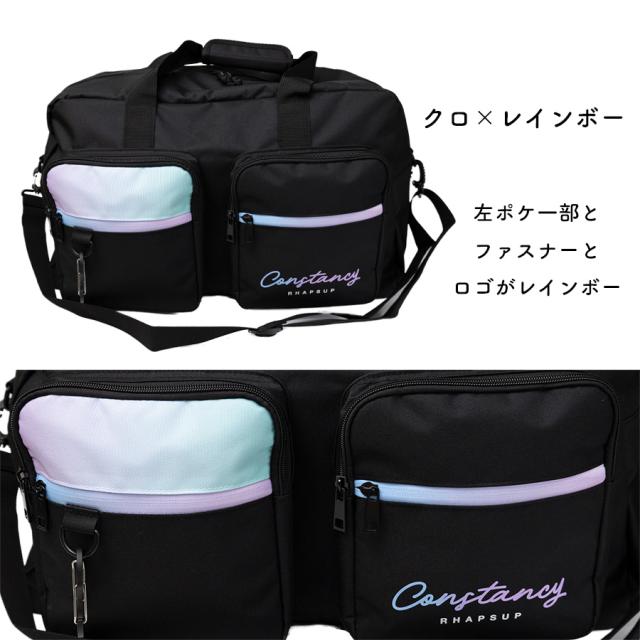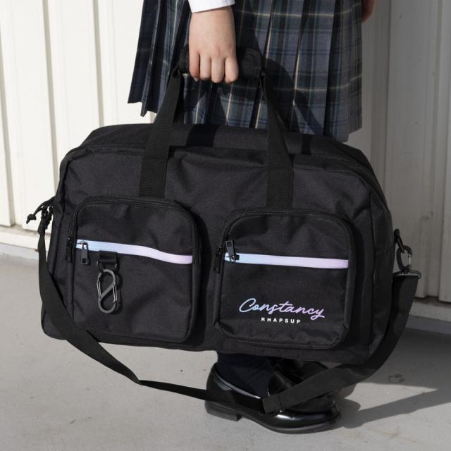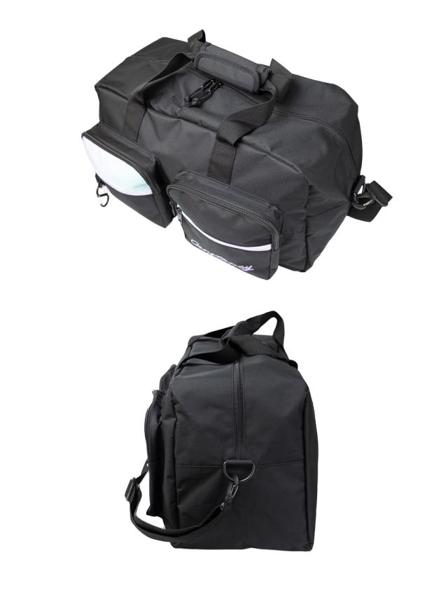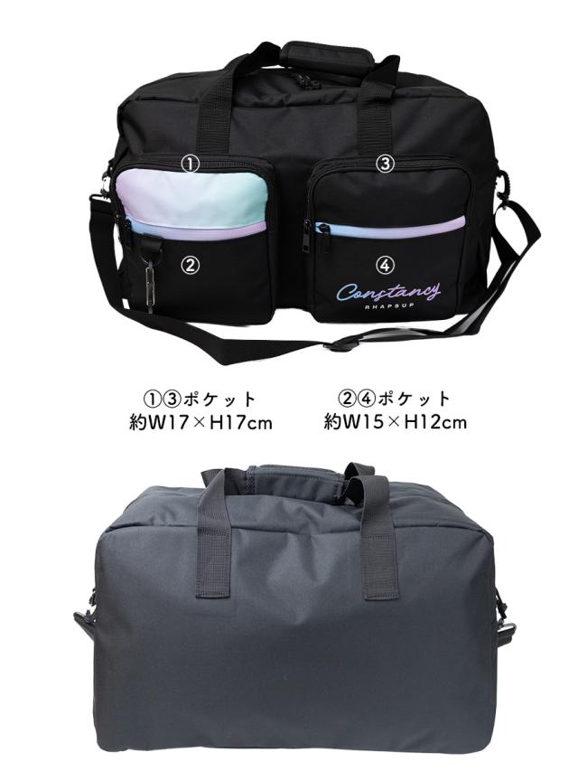■撥水加工を施した黒の本体にグラデーションのロゴやファスナーをあしらった約45L 2〜3泊程度サイズのボストンバッグです。Sカラビナ付きで可愛くチャームなどを付けることができます。