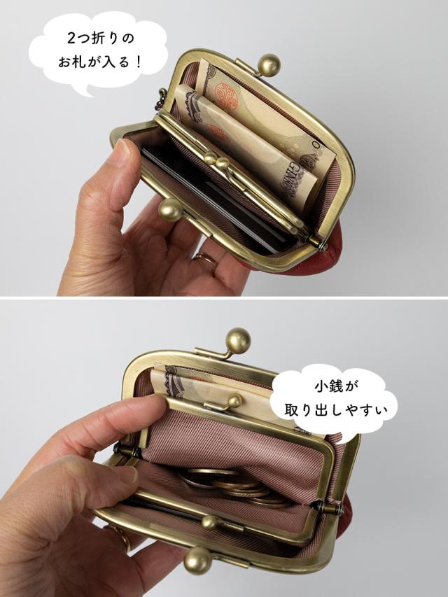 ■ガマ口の中にもう一つがま口がある親子型。中のがま口に小銭が、外側には2つ折りにしたお札やカードが収まります。内部の底は繋がっておらず独立したポケットになっているので外側に小銭を入れることもできます。メイン財布としてもお使いいただけますので、小さなバッグの時などの持ち替えにもお勧めです。