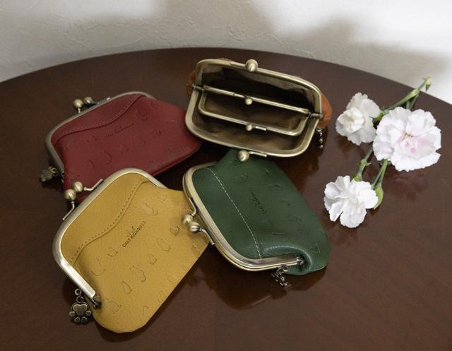 ■ふわっと柔らかな手触りの牛革にネコのシルエットの型押しを施した大人可愛いお財布シリーズです。アンティーク調のがま口と肉球のチャームがポイント!