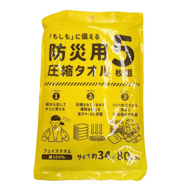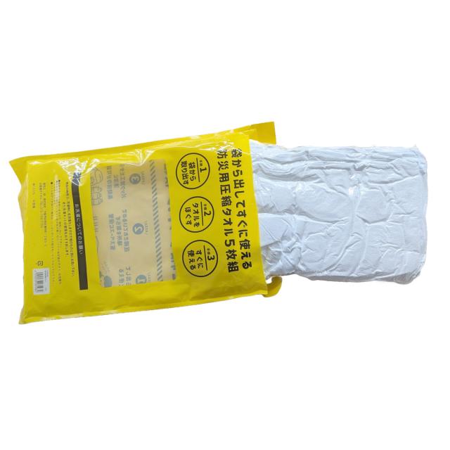 災害時の持ち出しに便利なコンパクトな5枚入タオルです。持ち出す時にかさばるタオルが圧縮されているので、コンパクトに持ち運びが出来ます。袋から取り出せばすぐに使えるので災害時はもちろん、旅行など長期のお出かけの際にも便利です。