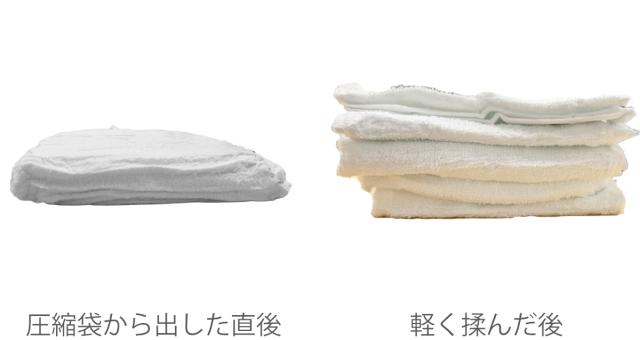 ぎゅっと圧縮されているので軽く揉めば柔らかい手ざわりのタオルになります。サイズも34×80cmと大きめなので、フェイスタオルとしてはもちろん、手や体を拭くのにも便利なサイズです。