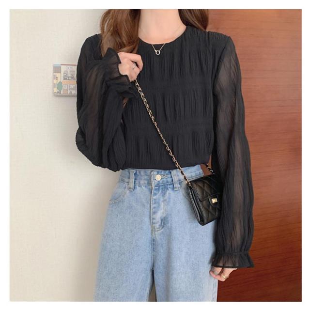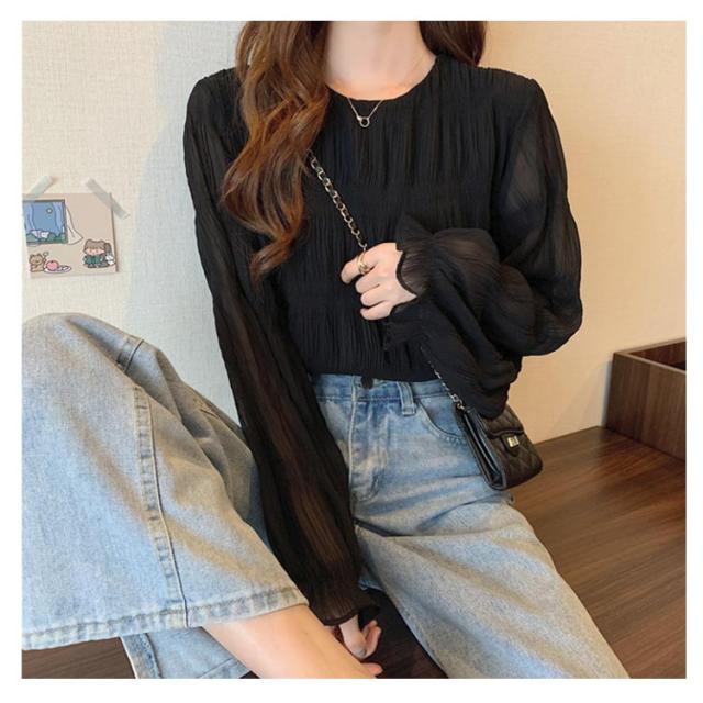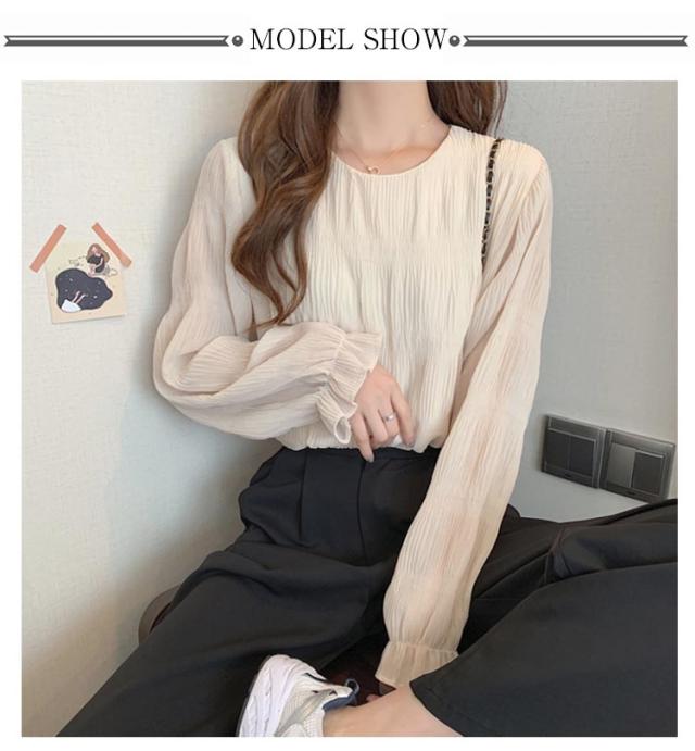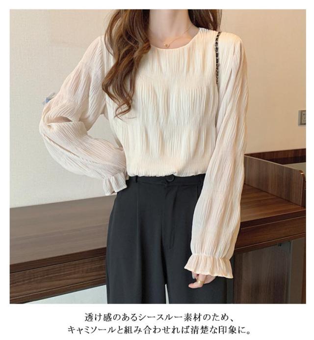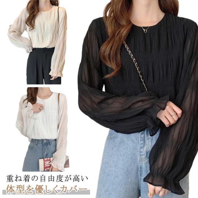 ブラウス レディース 長袖 ギャザーブラウス 20代 30代 40代 トップス プルオーバー 春 可愛い 秋 ラウンドネック シャーリング 透け感 フレア袖 大人 ボリュームスリーブ フェミニン シンプル カジュアル 50代 60代
