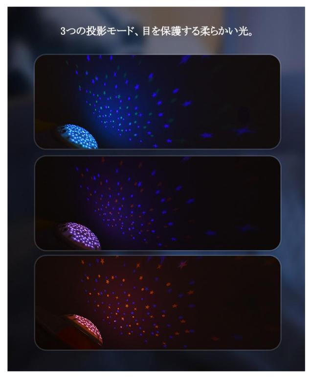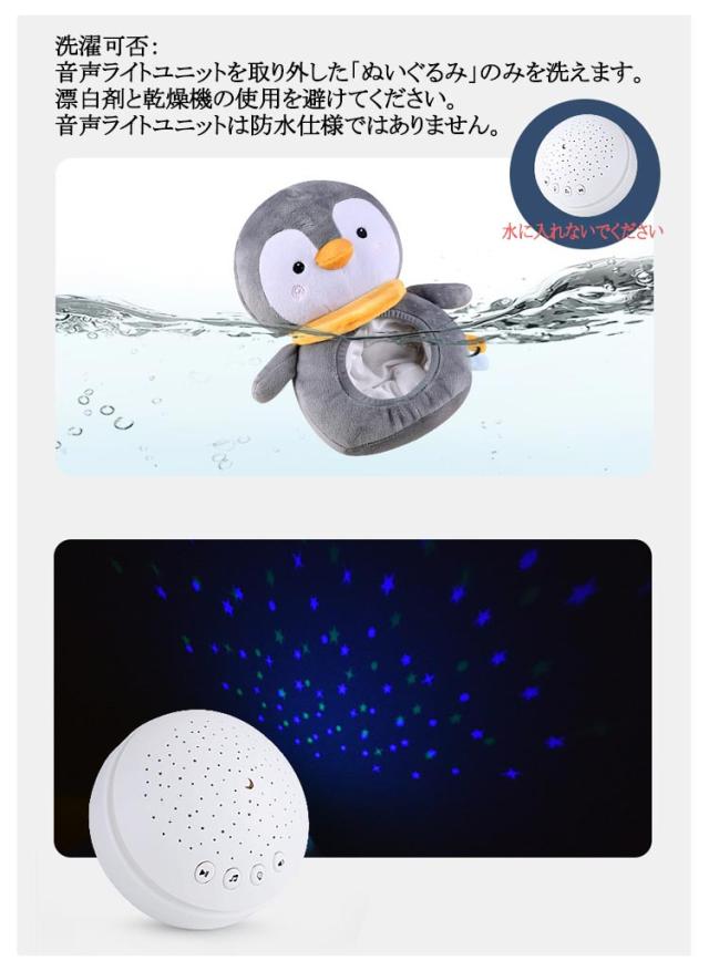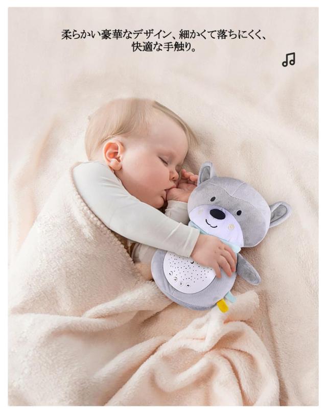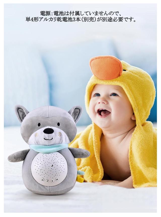 | 寝かしつけ ぬいぐるみ プロジェクションオルゴールは、星と月の光と影を投影します。柔らかく目に優しく、カラフルで段階的な投影効果により、赤ちゃんが早く眠りにつくのに役立ちます。 3つの投影モード、目を保護する柔らかい光 心地よい音楽(音楽、波、鳥のさえずり、雨)、穏やかで平和なメロディーで、赤ちゃんを甘い夢に誘います 柔らかい豪華なデザイン、細かくて落ちにくく、快適な手触り 使用上の注意点:落下防止のため、ぬいぐるみの腹部ホールはきつめに縫製してあります。音声ライトユニットがはまりにくい場合は、音声ライトユニットの溝にぬいぐるみの一部をはめて、回しながら取り付けてください。 洗濯可否:音声ライトユニットを取り外した「ぬいぐるみ」のみを洗えます。漂白剤と乾燥機の使用を避けてください。音声ライトユニットは防水仕様ではありません。 電源:電池は付属していませんので、単4形アルカリ乾電池3本(別売)が別途必要です。 | |