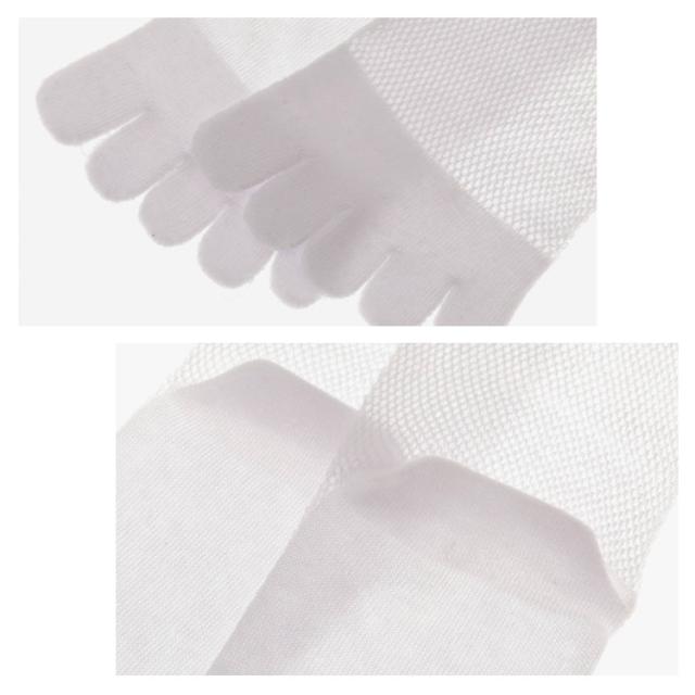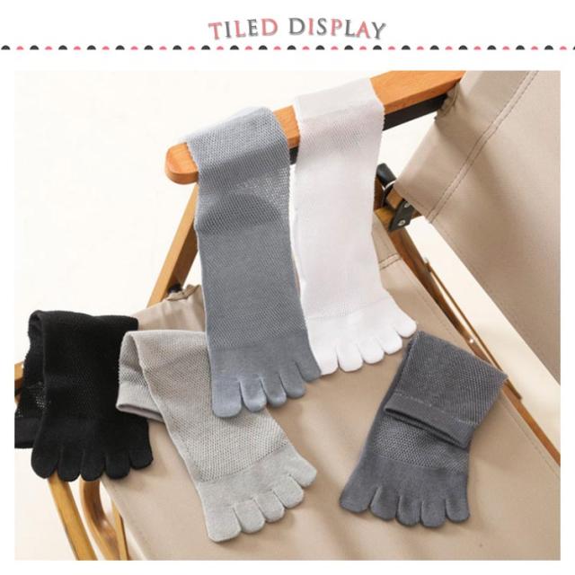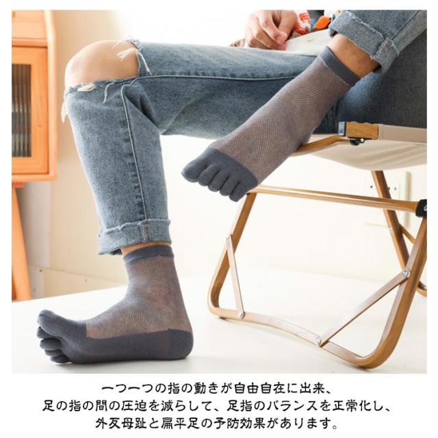 | 【5本指ソックス】【メッシュ構造】【2足セット】 5本指ソックスはメッシュ構造を採用して空気を流れやすい空気穴に形成されて、抜群な通気性を備え、蒸れにくい、汗を迅速に吸収・蒸発させ、長時間装着しても蒸し暑いばなど不快感がなく、肌面をサラリと快適に保ちます。 素材が抗菌防臭加工を施して5A抗菌性グレードを達して、消臭効果を発揮し、気になる雑菌や匂いを抑制します。 伸縮性が良く、長時間履いても締め付け感がない。 ビジネスマンから大学生・高校生まで年齢に限らず、独特なスタイルを着ることができます。 5本の指部分がそれぞれ独立しており、足のムレを軽減することにより、水虫の予防に助かります。 一つ一つの指の動きが自由自在に出来、足の指の間の圧迫を減らして、足指のバランスを正常化し、外反母趾と扁平足の予防効果があります。 指が1本ずつ独立しているので踏ん張りが利き、指がしっかり大地をつかむため歩きやすく足の疲労度を少なくしてくれます。 着用時の形が素足に近いから、室内で下駄も簡単に履きられますので、楽しみにしてください。 | |