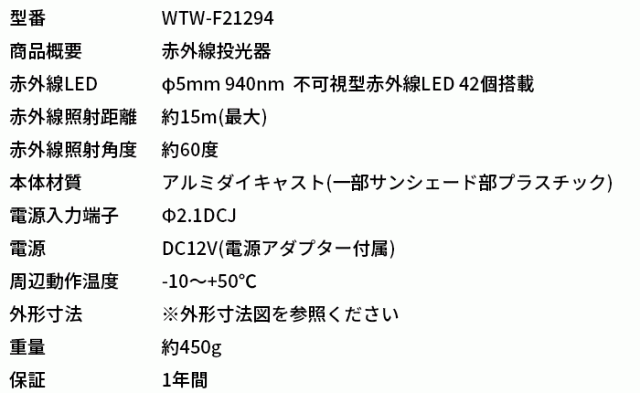 WTW-F21294は、国内の大手防犯カメラメーカー塚本無線社製の、近〜中距離照射型(最大約15m照射)不可視型赤外線投光器です。