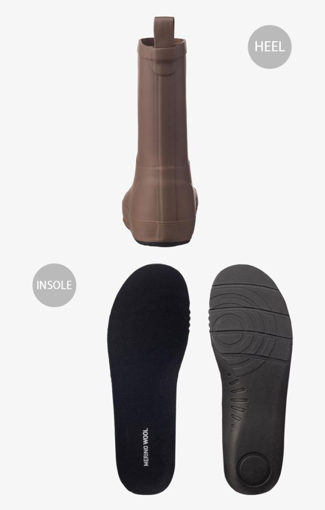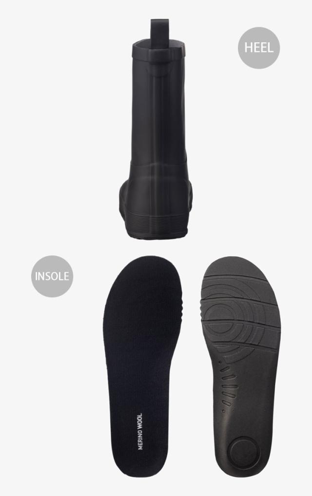 全体的にゴム素材を適用し、防水機能とともに靴の内側には柔らかい裏地素材を適用し、快適なフィット感を提供します。