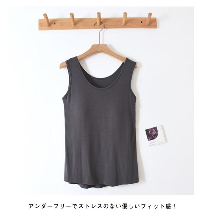 | 締め付けない、カップ付きタンクトップ。 アンダーフリーでストレスのない優しいフィット感! パッドは縫われて固定されているためズレません。 ほどよく前面がフィットし、締め付け感なしでリラックスしたい休日などにぴったりです。 さらりとした着心地、伸縮性・速乾性に優れていてボディラインに沿うキレイなシルエット。 一枚で着ても、インナーとしても、ストレスなく着られるシンプルなカットソーです。 | |