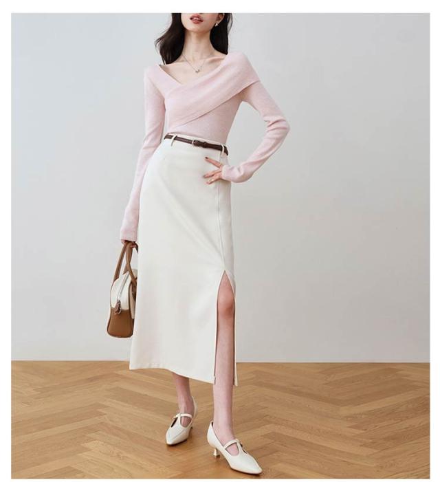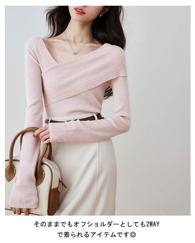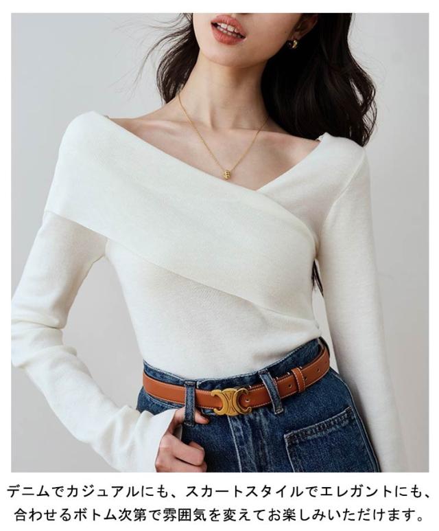 プルオーバー トップス オフショルニットトップス セーター オフショルニットトップス カシュクール レディース Tシャツ オフショルダー クロスネック tシャツ vネック 長袖 スリムフィット タイト 細身 無地
