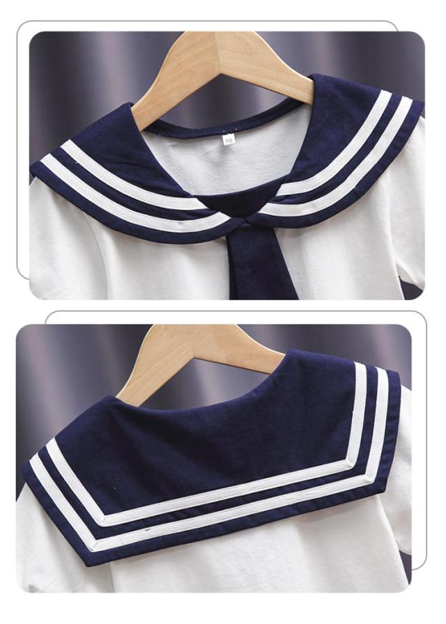 | 【110〜160cm】【綿素材】 マリン風で可愛いセーラー服Tシャツ! キッズも気持ち良く着用できるよう、綿混の生地を採用 パンツもスカートもOKな、合わせるボトムスを選ばない着まわし力の高いアイテム | |