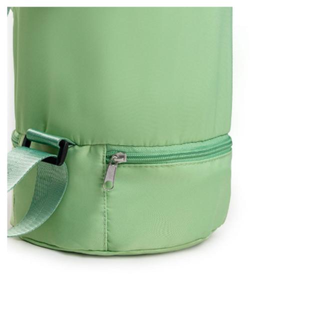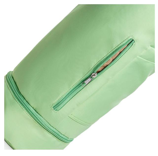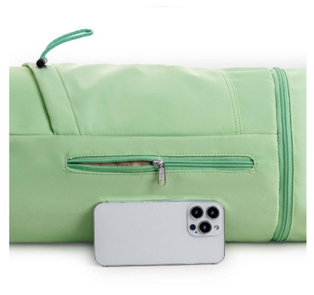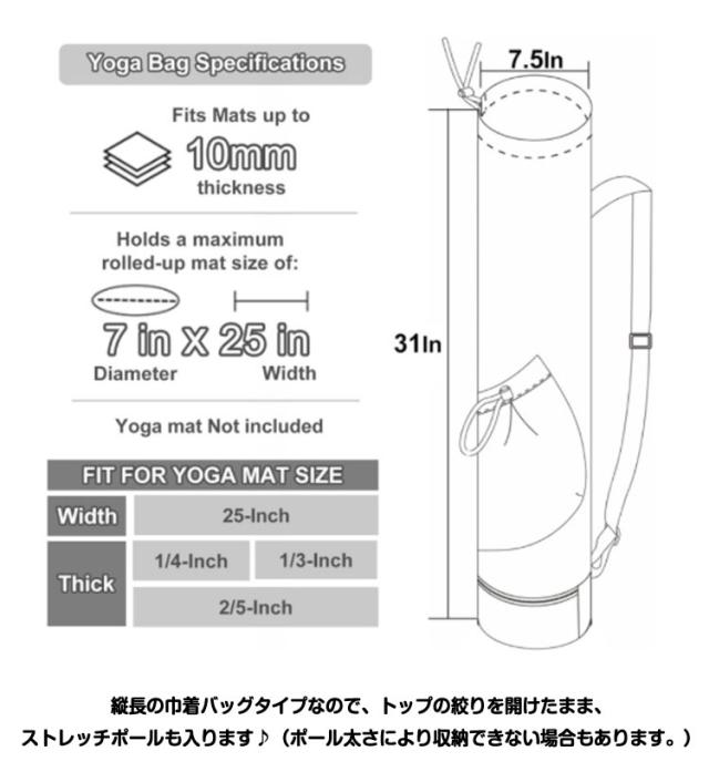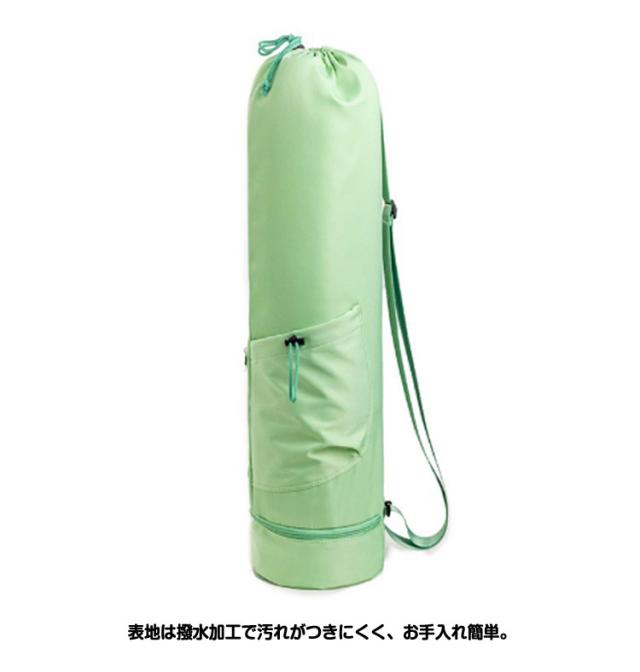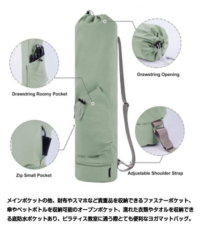 | 小物入るポケットもたくさんあり、ヨガスタジオにはこれ一つで行けるヨガマットケース メインポケットの他、財布やスマホなど貴重品を収納できるファスナーポケット、傘やペットボトルを収納可能のオープンポケット、濡れた衣類やタオルを収納できる底防水ポケットあり、ピラティス教室に通う際とても便利なヨガマットバッグ。 縦長の巾着バッグタイプなので、トップの絞りを開けたまま、ストレッチポールも入ります♪(ポール太さにより収納できない場合もあります。) ショルダーバッグ型で、両手がフリーで持ち運びやすいです。 表地は撥水加工で汚れがつきにくく、お手入れ簡単。 | |