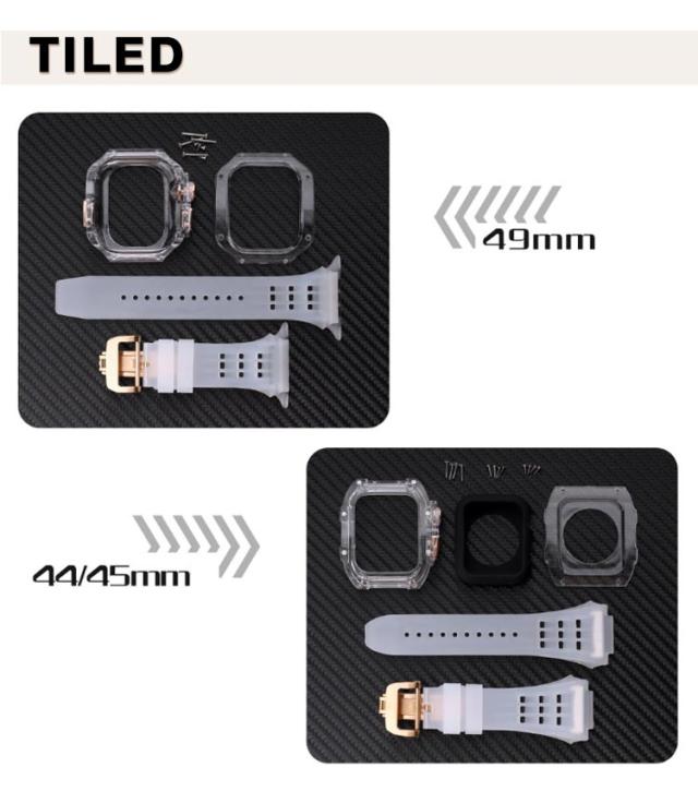 | アップルウォッチケースとアップルウォッチバンドの2点セットです。 ビジネスシーンでもストレスなく軽量バンドなので毎日使用するアップルウォッチにご利用頂けます。 カジュアルなアップルウォッチが上品で高級感のある腕時計のようになるケースベルトです。 半透明のアップルウォッチのカバーも付いているのでオシャレのコーデが楽しめます。 ベルトは水に強いシリコン素材を使用。濡れたら乾いた布でさっと拭くだけ。汚れても水拭きできるので清潔感が保てます。 プライベートからオフィスシーンまで、シーンを選ばない優秀ベルト♪快適な着け心地をお楽しみください! アダプター付きで簡単に装着でき安全に交換可能です。 本体装着方法: 1.ラバーブロテクトが付属しております ので装着していきます。 2.画面に干渉しないように取り付けます。 3.ラバーバンドをケースに差し込みます。 4.ケースの穴の部分にピンを両サイド各2本のロックピンを差し込みます。 5.クラウンボタンに合わせて装着します。 6.裏蓋を被せて一個ずつねじを締めて行きます。 7.Dバックルをお好みの位置で合わせて ピンを穴に入れ込みます。 8.Dバックルを開いて手首に巻き後は戻すだけで簡単に装着出来ます。 | |