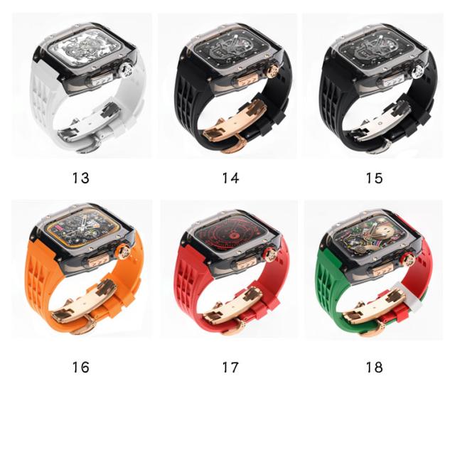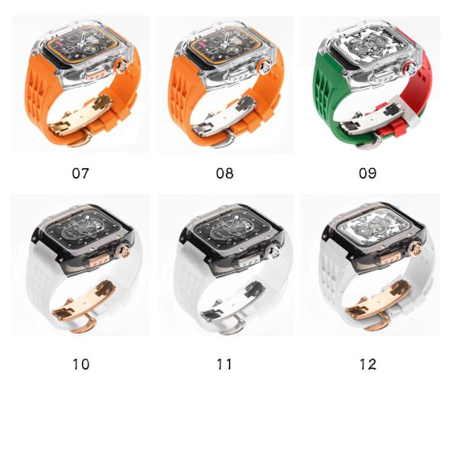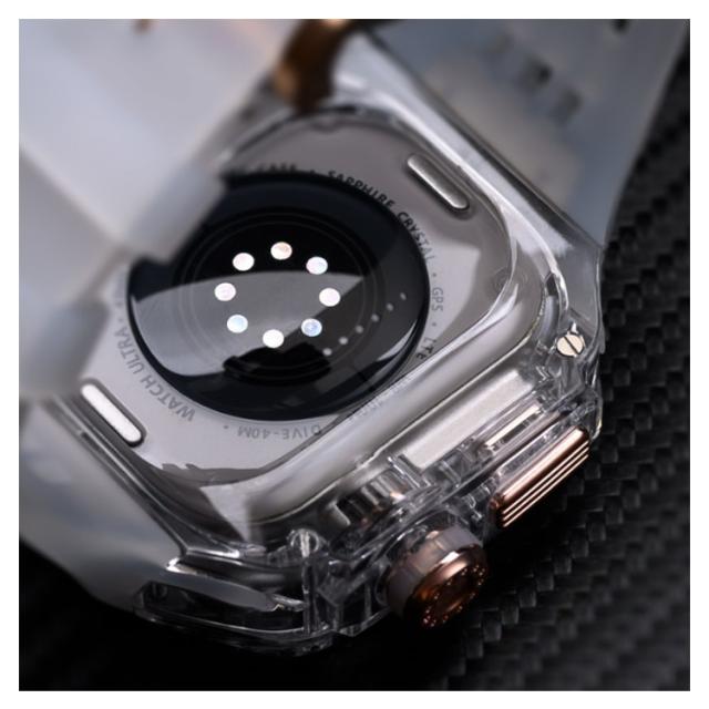 | アップルウォッチケースとアップルウォッチバンドの2点セットです。 ビジネスシーンでもストレスなく軽量バンドなので毎日使用するアップルウォッチにご利用頂けます。 カジュアルなアップルウォッチが上品で高級感のある腕時計のようになるケースベルトです。 半透明のアップルウォッチのカバーも付いているのでオシャレのコーデが楽しめます。 ベルトは水に強いシリコン素材を使用。濡れたら乾いた布でさっと拭くだけ。汚れても水拭きできるので清潔感が保てます。 プライベートからオフィスシーンまで、シーンを選ばない優秀ベルト♪快適な着け心地をお楽しみください! アダプター付きで簡単に装着でき安全に交換可能です。 本体装着方法: 1.ラバーブロテクトが付属しております ので装着していきます。 2.画面に干渉しないように取り付けます。 3.ラバーバンドをケースに差し込みます。 4.ケースの穴の部分にピンを両サイド各2本のロックピンを差し込みます。 5.クラウンボタンに合わせて装着します。 6.裏蓋を被せて一個ずつねじを締めて行きます。 7.Dバックルをお好みの位置で合わせて ピンを穴に入れ込みます。 8.Dバックルを開いて手首に巻き後は戻すだけで簡単に装着出来ます。 | |