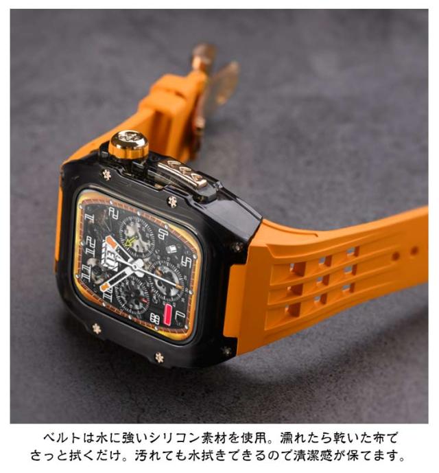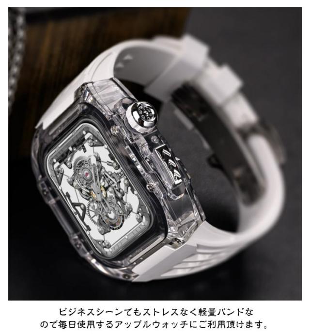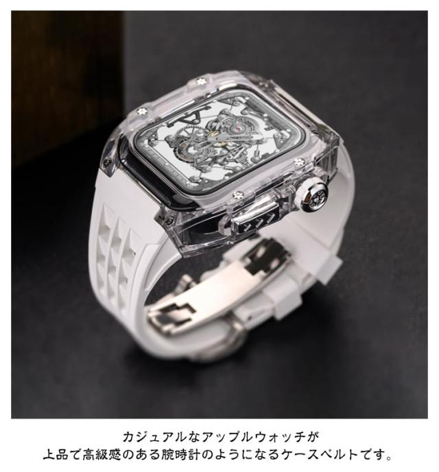 | アップルウォッチケースとアップルウォッチバンドの2点セットです。 ビジネスシーンでもストレスなく軽量バンドなので毎日使用するアップルウォッチにご利用頂けます。 カジュアルなアップルウォッチが上品で高級感のある腕時計のようになるケースベルトです。 半透明のアップルウォッチのカバーも付いているのでオシャレのコーデが楽しめます。 ベルトは水に強いシリコン素材を使用。濡れたら乾いた布でさっと拭くだけ。汚れても水拭きできるので清潔感が保てます。 プライベートからオフィスシーンまで、シーンを選ばない優秀ベルト♪快適な着け心地をお楽しみください! アダプター付きで簡単に装着でき安全に交換可能です。 本体装着方法: 1.ラバーブロテクトが付属しております ので装着していきます。 2.画面に干渉しないように取り付けます。 3.ラバーバンドをケースに差し込みます。 4.ケースの穴の部分にピンを両サイド各2本のロックピンを差し込みます。 5.クラウンボタンに合わせて装着します。 6.裏蓋を被せて一個ずつねじを締めて行きます。 7.Dバックルをお好みの位置で合わせて ピンを穴に入れ込みます。 8.Dバックルを開いて手首に巻き後は戻すだけで簡単に装着出来ます。 | |