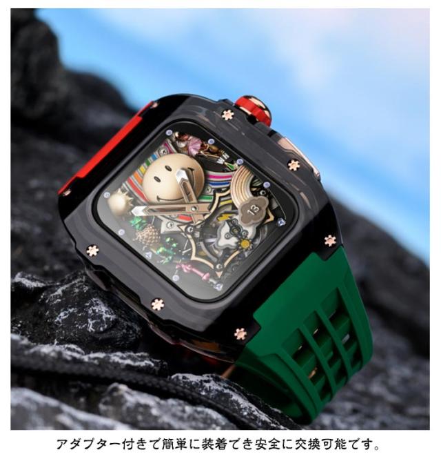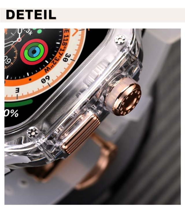 | アップルウォッチケースとアップルウォッチバンドの2点セットです。 ビジネスシーンでもストレスなく軽量バンドなので毎日使用するアップルウォッチにご利用頂けます。 カジュアルなアップルウォッチが上品で高級感のある腕時計のようになるケースベルトです。 半透明のアップルウォッチのカバーも付いているのでオシャレのコーデが楽しめます。 ベルトは水に強いシリコン素材を使用。濡れたら乾いた布でさっと拭くだけ。汚れても水拭きできるので清潔感が保てます。 プライベートからオフィスシーンまで、シーンを選ばない優秀ベルト♪快適な着け心地をお楽しみください! アダプター付きで簡単に装着でき安全に交換可能です。 本体装着方法: 1.ラバーブロテクトが付属しております ので装着していきます。 2.画面に干渉しないように取り付けます。 3.ラバーバンドをケースに差し込みます。 4.ケースの穴の部分にピンを両サイド各2本のロックピンを差し込みます。 5.クラウンボタンに合わせて装着します。 6.裏蓋を被せて一個ずつねじを締めて行きます。 7.Dバックルをお好みの位置で合わせて ピンを穴に入れ込みます。 8.Dバックルを開いて手首に巻き後は戻すだけで簡単に装着出来ます。 | |