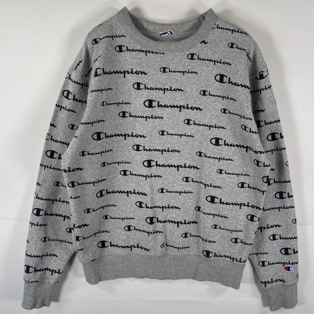 古着 チャンピオン Champion スウェット トレーナー クルーネック ロゴプリント 総柄 プルオーバー M グレー メンズ