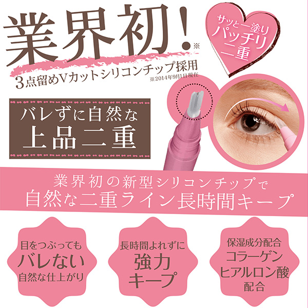特殊形状(業界初)の3点留めVカットシリコンチップで、まぶたの構造にあった適量のエッセンスを塗ることができ、ひと塗りでどなたにでもカンタンに理想の二重ラインを作ることができます。