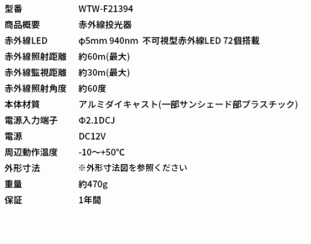 【WTW-F21394】 不可視型赤外線投光器(約60m) |