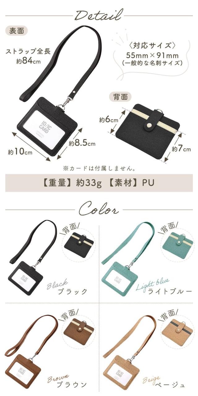 カードホルダー/横型/首掛け/ネックストラップ/背面ポケット付き/idカードホルダー/パスケース/カードケース/高級感/上品/レディース/メンズ/シンプル/おしゃれ/かわいい/ブランド/首かけ/社員証/定期入れ/idケース/ic/薄型/ネームホルダー/id/ホルダー/落ちない/両面/ボタン付き/ユニセックス/男女兼用/名刺入れ/PUレザー/レザー/人気/男性/女性/オフィス/通勤/通学/フォーマル/スタイリッシュ/名札/名札ケース/セキュリティカード/資格証/透明窓/学生証/黒/ブラック/ライトブルー/ブラウン/ベージュ/TN-IDCC