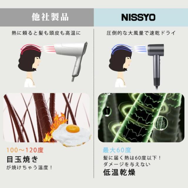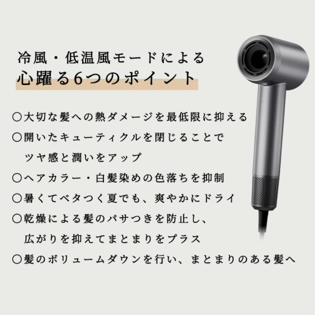 また、30℃の冷風、40℃の低温風、60℃の熱風、30?90℃の温冷リズムの13つの風温×2つの風速モードを備えており、あらゆるニーズに合わせて使い分けられる大風量ヘアドライヤーです。