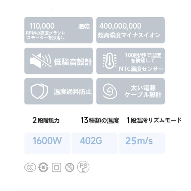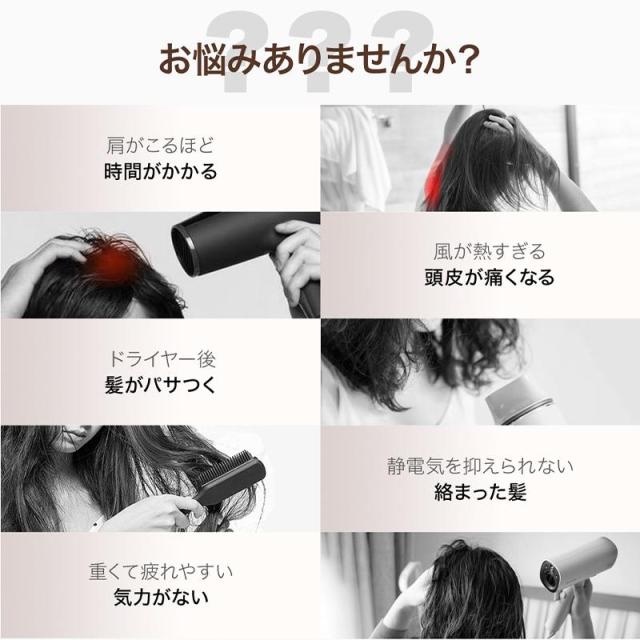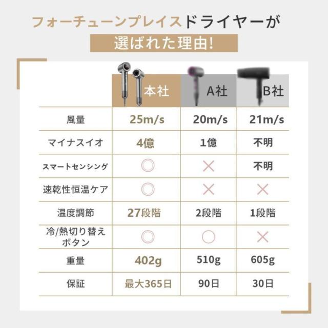 ?【4億高濃度マイナスイオン放出】-フォーチューンプレイス-ヘアドライヤーは従来品の数十倍の4億もの高濃度マイナスイオンを放出します。パワフルな風で髪に届け、表面をコーティングし、静電気を抑制。髪の水分を保護し、マイナスイオンの力でキューティクルのダメージを修復します。?【AI温度コントロール?ダメージカット】】NTCサーモスタットを搭載し、毎秒110回の温度測定とコントロールにより、髪表面の水分を素早く取り去りながらも、過度な熱によるダメージを防ぎます。デリケートな頭皮でも安心してご利用いただけます。?【低騒音?軽量で持ち運び便利】-フォーチューンプレイス-ヘアケアドライヤーはDCモーター採用により、55?の低騒音を実現。超軽量設計で、長時間持っても疲れにくく、美容師にも好評です。コンパクトなサイズで場所を取らず、旅行や出張にも最適な持ち運びが可能です。?【高級感のあるラッピング】高級感のあるギフト包装で、母の日や誕生日などのプレゼントに最適です。?【国内正規品?メーカー保証】-フォーチューンプレイス-製品は日本で企画され、ISO9001認証の工場で製造されており、一年間のメーカー保証が付いています。万が一商品に不具合があれば、保証規約に従い返金や交換などの対応をさせていただきます。商品に関するご質問やご不明点がございましたら、お気軽にお問い合わせください。ご購入前の注意事項 ?写真は実物と同じように撮影されます。撮影中の光とモニターの解像度が異なるため、多少の色の違いは品質上の問題ではございませんので、ご了承頂けない方は慎重にご検討下さい。?仕様などは改善?改良のため、予告なく変更することがあります。