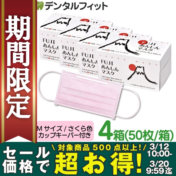 【★10%OFF 3/20 9:59迄】マスク 口元ワイヤー 日本製 FUJIあんしんマスク さくら色 Mサイズ カップキーパー付 4箱セット(50枚入/箱) 【4層構造 不織布マスク】【返品・交換不可】