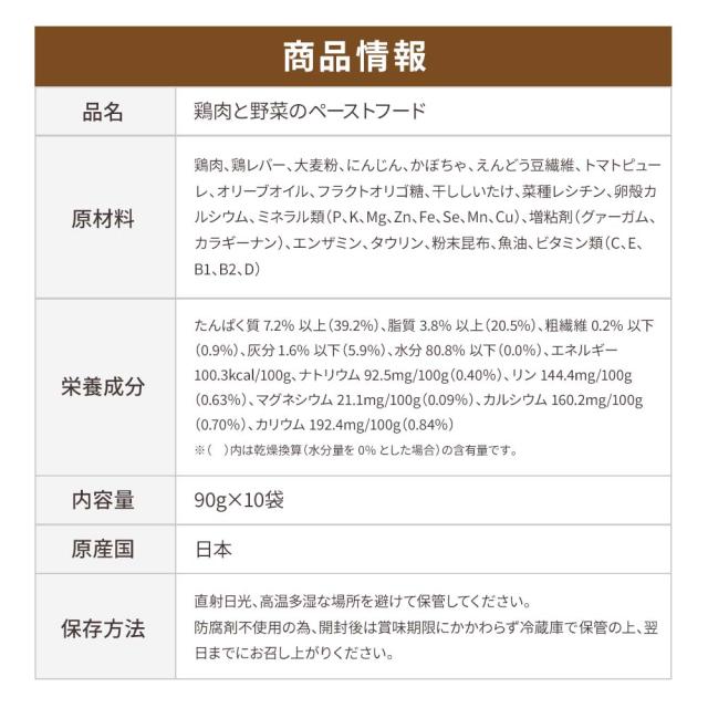 ヒューマングレード・エンザミン配合・国内製造の鶏肉と野菜のペーストフード「鶏肉と野菜のペーストフード」はシニア犬・シニア猫向けペースト食です。