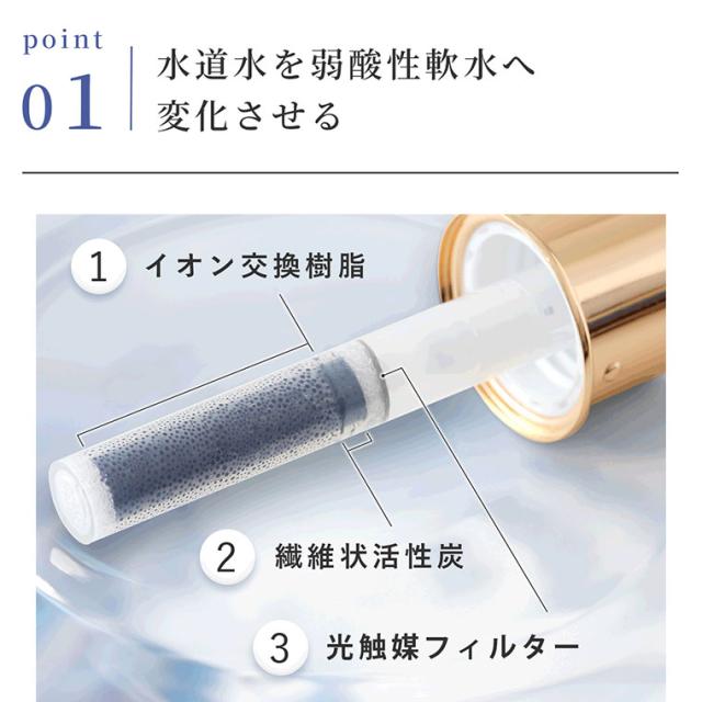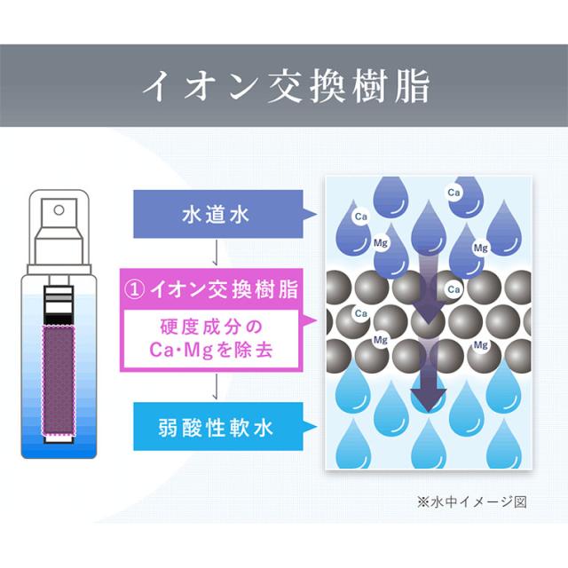 1. 水道水はイオン交換樹脂を通り、弱酸性軟水に変換されます。2. 繊維状活性炭より水の塩素除去・脱臭されます。