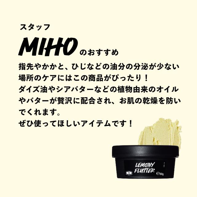 水、シア脂、ミツロウ、テオブロマグランジフロルム種子脂、ダイズ油、アボカド油、アマニ油、マンゴー種子脂、ヤシ油、ヒマシ油、香料、レモン果実エキス、コムギ胚芽油、レモン果皮油、ラベンダー油、シオザキソウ花油、カミツレ花油、ステアリン酸、TEA、セテアリルアルコール、PG、メチルパラベン、プロピルパラベン、クチナシ黄広告文責:ラッシュジャパン合同会社 0120-125-204